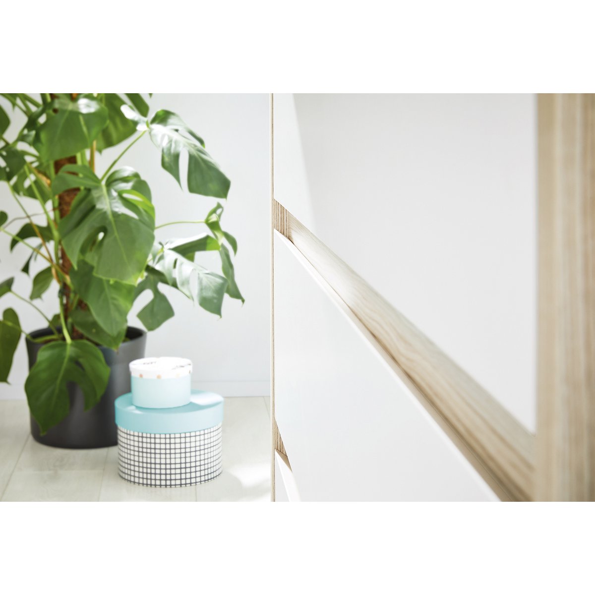 • Décor : frêne avec motif en bois véritable et uni, blanc