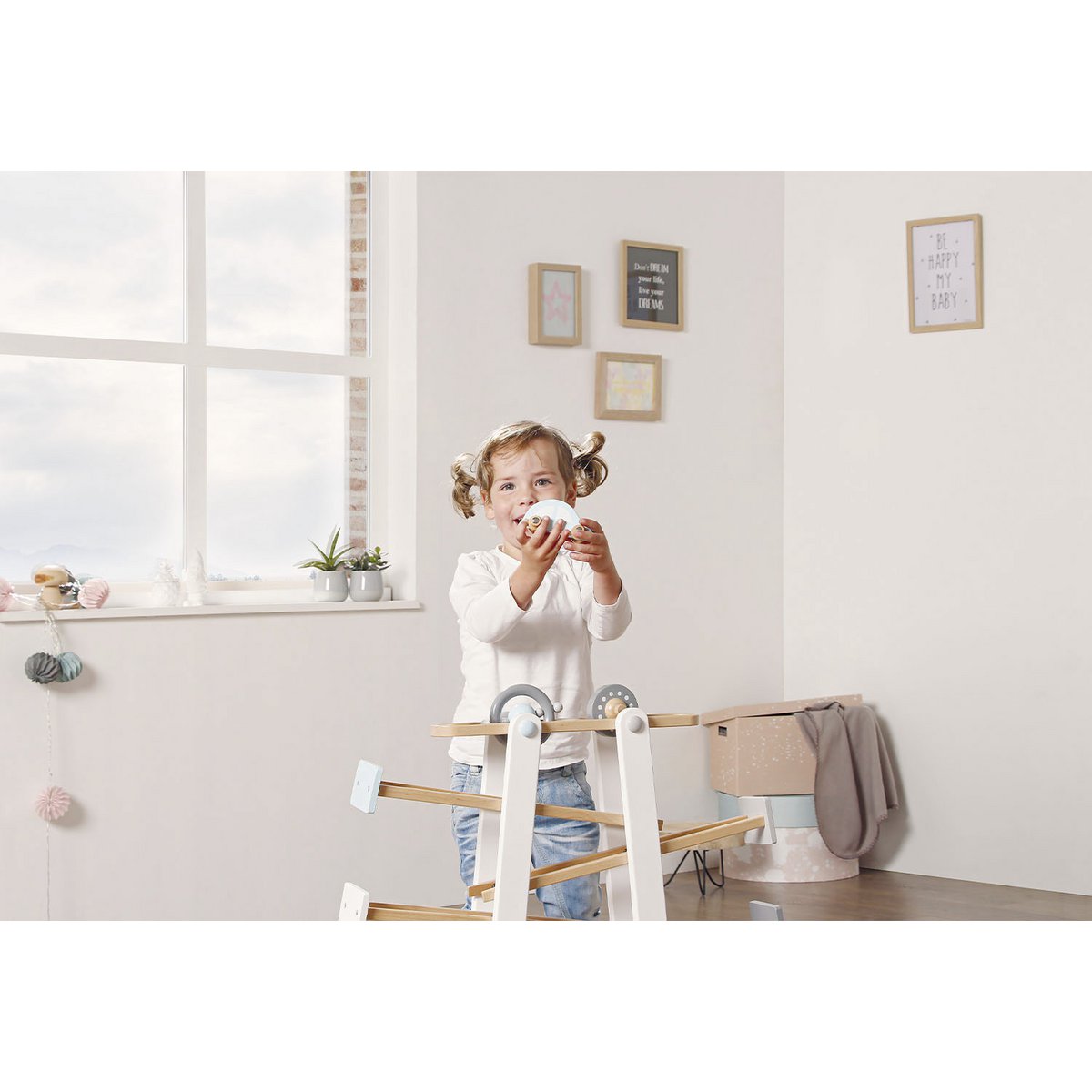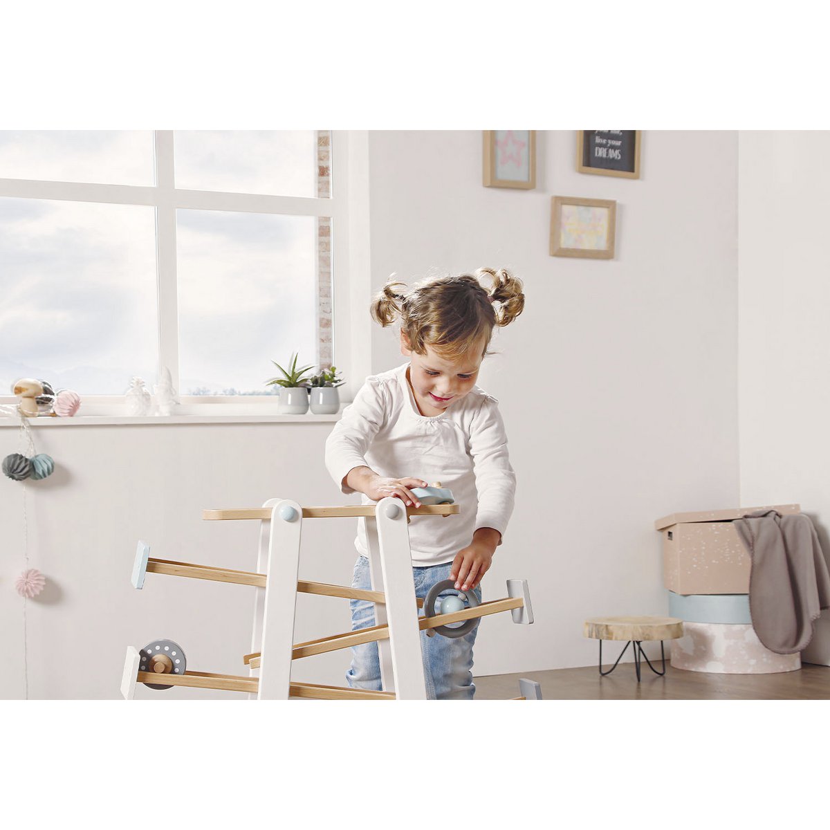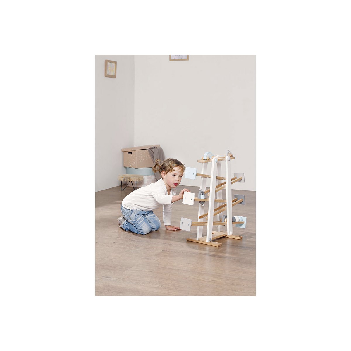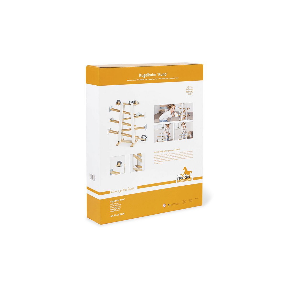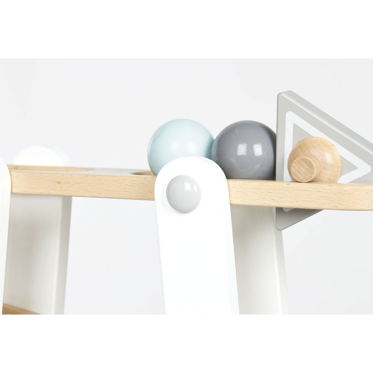 • 9 pièces : 1 piste de billes, 4 billes en bois colorées (Ø 45 mm), 4 éléments roulants