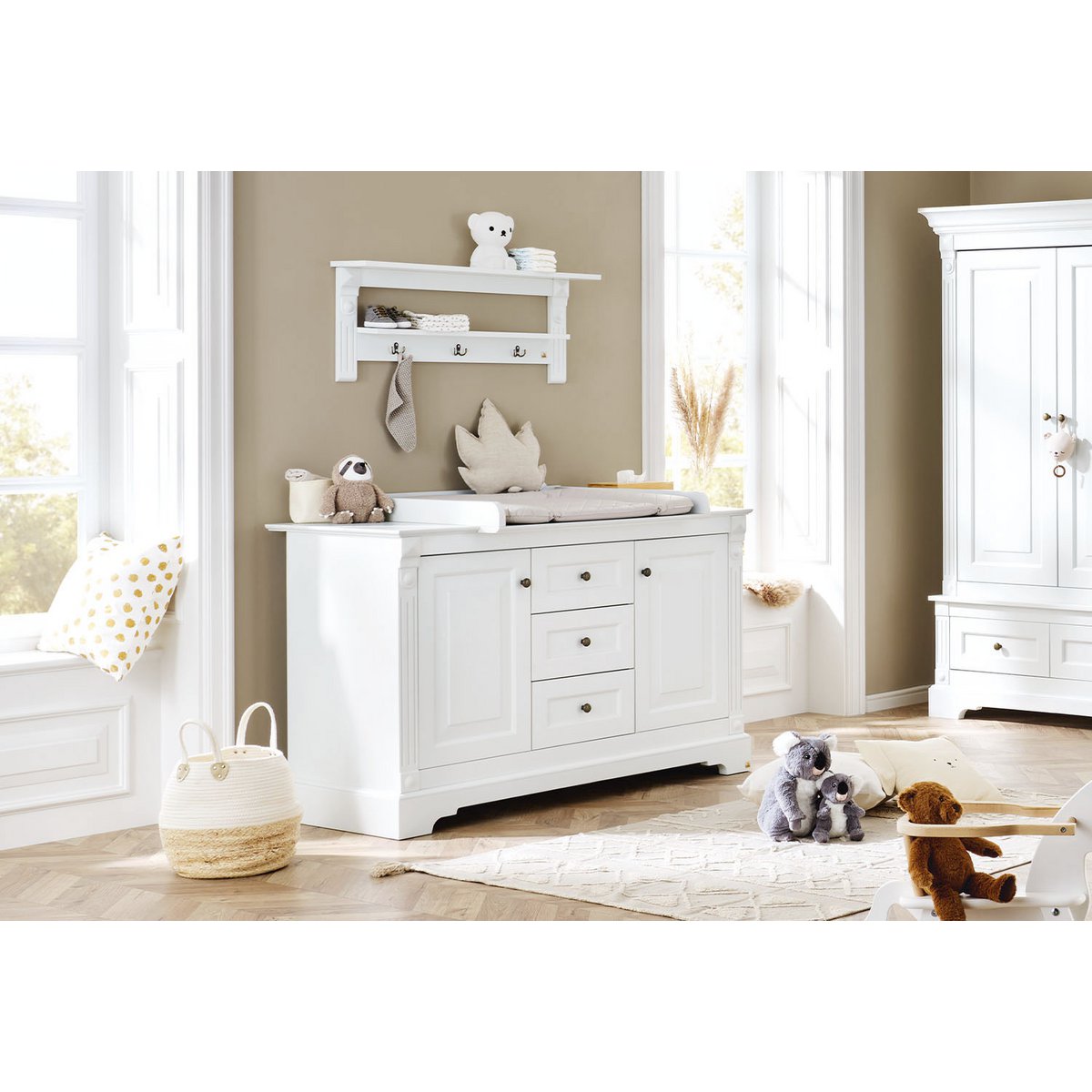 L’amovible plan à langer (dimensions intérieures : 85 × 75 cm) convient à tous les matelas à langer standards. Une fois la période de change terminée, il peut être retiré facilement, transformant la commode en un buffet intemporel et durable.