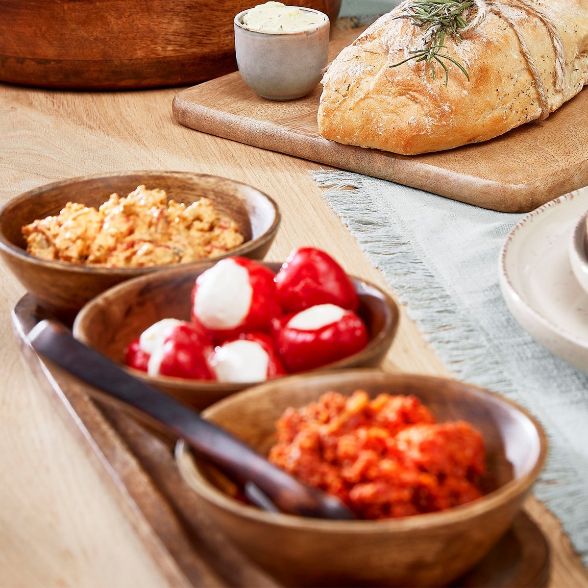 Les bols Tomar avec plateau proviennent et sont idéaux pour servir des collations. Les bols sont fabriqués en bois de manguier certifié FSC® dans une couleur marron foncé chaude. Les bols sont vendus sous forme d'ensemble, trois petits bols et un plateau ovale. Les bols sont parfaits pour servir des tapas ! Les dimensions sont L36 x L12 x H5 cm. Le contenu est de 200 ml par bol.